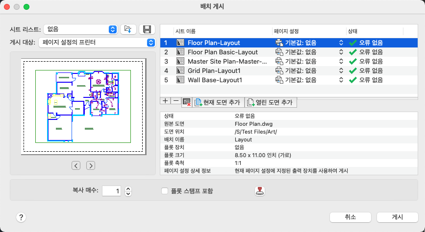 상태, 원본 도면, 도면 위치, 배치 이름, 플롯 장치, 플롯 크기, 플롯 축척 및 페이지 설정 상세 정보와 같은 선택한 시트에 대한 정보를 표시합니다.