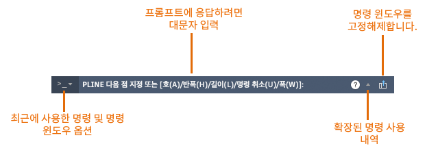 명령을 입력하고 나면 명령행에 일련의 프롬프트가 표시될 수 있습니다. 예를 들어, PLINE을 입력하고 첫 번째 프롬프트를 지정하고 나면 다음과 같은 프롬프트가 표시됩니다.