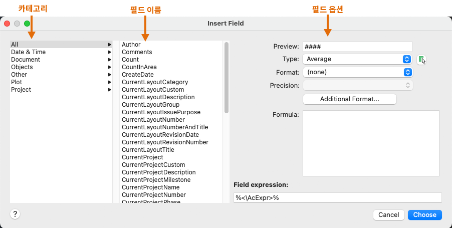 필드 삽입 대화상자에서 범주 및 필드 이름을 선택합니다.