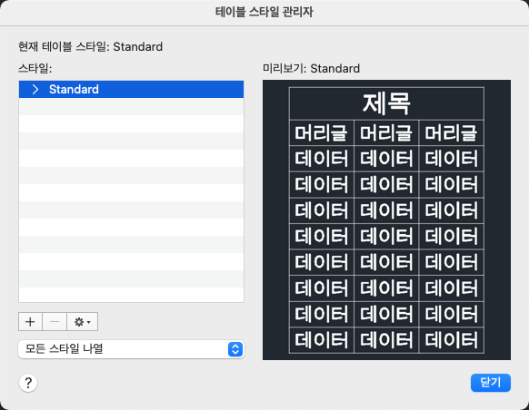 현재 도면의 기존 테이블 스타일이 테이블 스타일 관리자 대화상자에 나열됩니다.