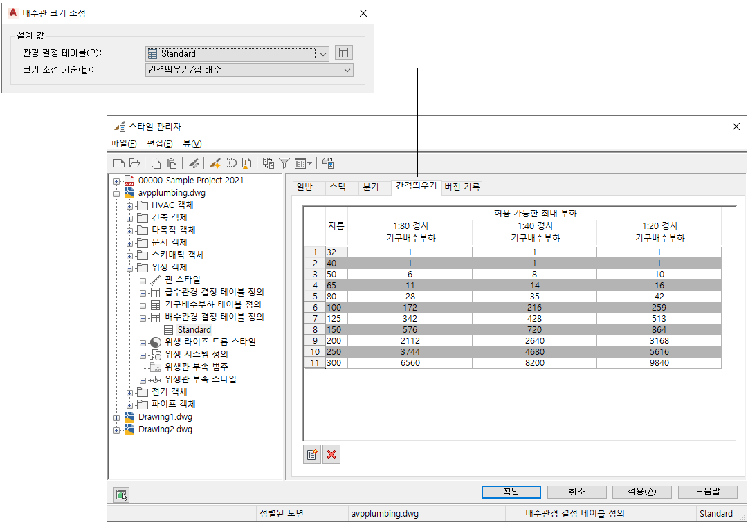 배수 런을 간격띄우기나 집 배수로 정의하면 위생 모듈에서 배수관경 결정 테이블(관경 결정 테이블)의 간격띄우기 탭에 있는 정보를 사용하여 크기 조정 계산을 수행합니다. 이 배수관경 결정 테이블의 정의는 스타일 관리자에서 확인할 수 있습니다.