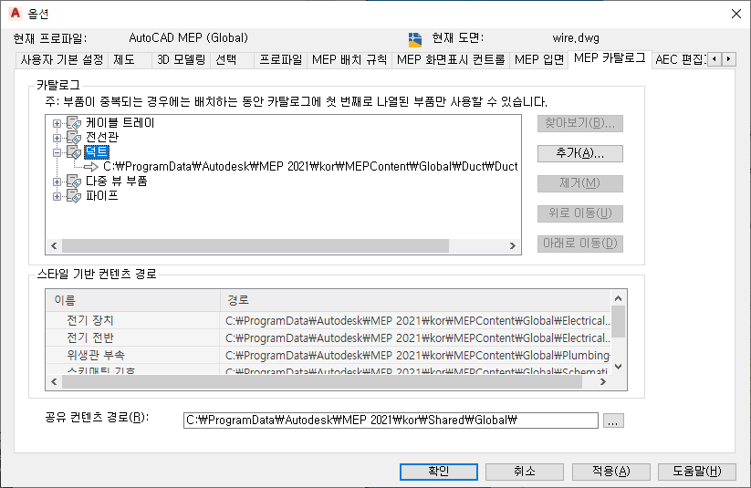 옵션 대화상자에서 배치 중에 사용할 컨텐츠(부품 카탈로그 및 스타일 기반 컨텐츠)의 위치를 지정합니다. 컨텐츠를 컴퓨터에 저장한 경우에는 해당 대화상자에서 로컬 위치를 지정합니다. 여러 사용자가 공유하기 때문에 네트워크에 컨텐츠를 저장한 경우에는 네트워크 위치를 지정합니다.