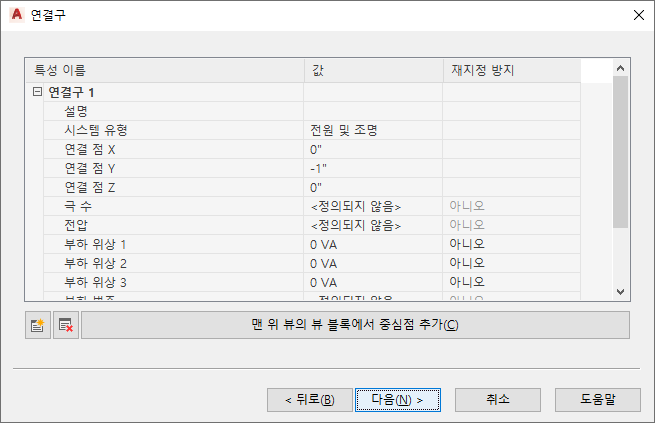 | 장치 중심에 연결구 배치 | 맨 위 뷰의 뷰 블록에서 중심점 추가를 클릭합니다. |