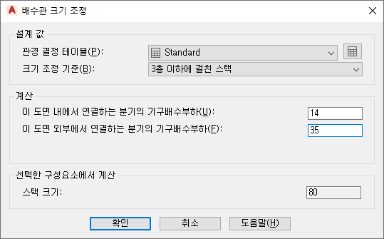 간격띄우기나 집 배수를 기반으로 크기를 조정한 경우 배수관 크기 조정 대화상자에는 도면의 간격띄우기 및 집 배수에 대한 크기 조정 결과가 표시됩니다.