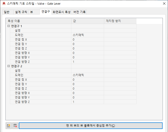 스크립트의 연결구 배치 특성은 탭에 표시되지 않습니다. 스타일 관리자에서는 X, Y, Z 좌표를 입력하거나 이미지에 표시된 옵션을 사용하여 블록의 중심에 연결구를 배치하여 연결구 위치만 지정할 수 있습니다.