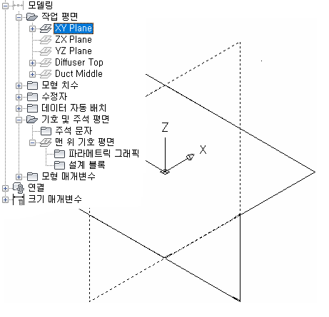 .부품 브라우저에서 작업 평면을 선택하면 모델링 영역에서 해당 작업 평면이 강조표시됩니다.