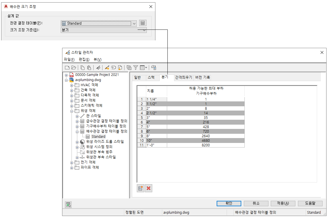 배수 런을 분기로 정의하면 소프트웨어에서 배수관경 결정 테이블(관경 결정 테이블)의 분기 탭에 있는 정보를 사용하여 크기 조정 계산을 수행합니다. 이 배수관경 결정 테이블의 정의는 스타일 관리자에서 확인할 수 있습니다.