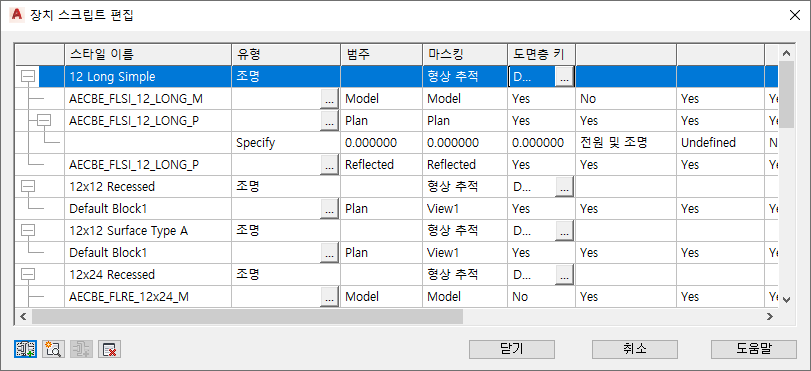 스크립트의 범주 특성은 스타일 관리자에 표시되지 않습니다. 장치 범주는 장치 선택 워크시트에서 장치(장치 스타일)를 그룹화하는 메커니즘으로서 사용 가능한 장치를 쉽게 찾을 수 있습니다. 워크시트에서 직접 장치 범주를 작성하고 관리합니다. 자세한 내용은 AutoCAD MEP 2023 toolset에서 범주 작성을 참고하십시오.