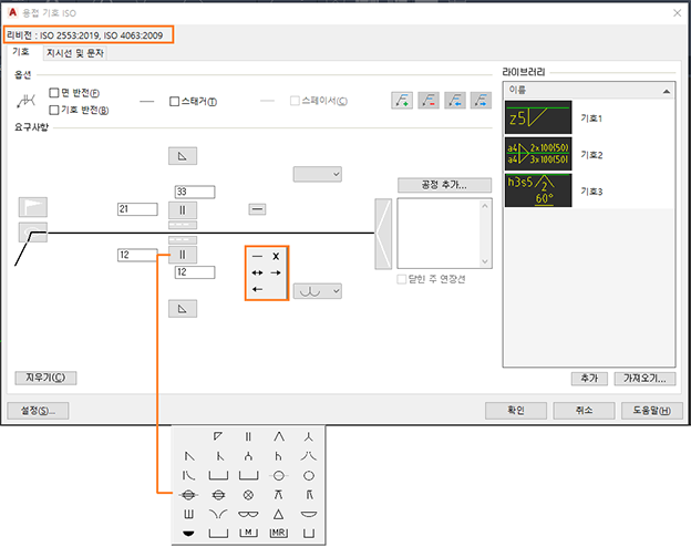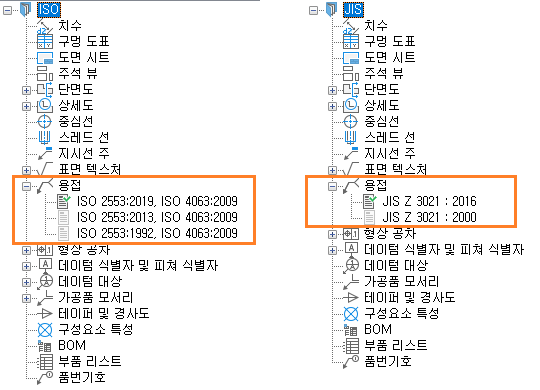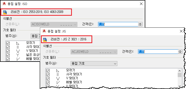 용접 설정 대화상자에 최신 ISO 및 JIS 리비전이 표시됩니다. 해당 용접 및 뒤붙임 기호도 기호 필터에 나열됩니다.