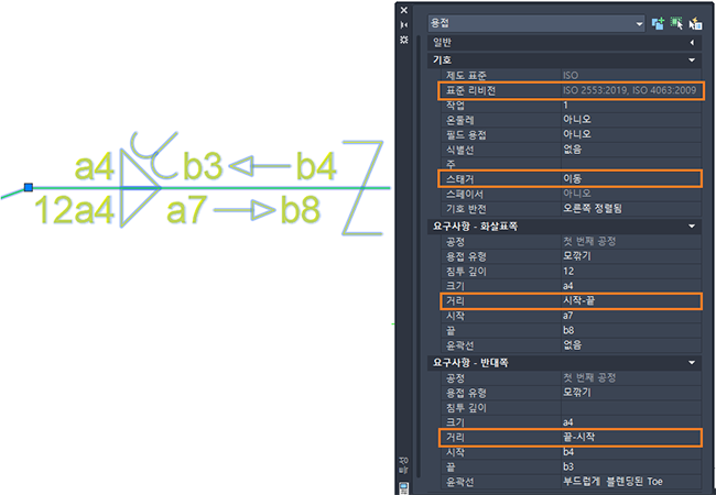 특성 팔레트에서 모든 용접 기호 특성을 보고 수정할 수 있습니다.