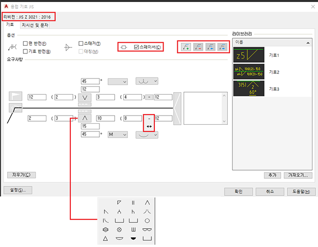 또한 용접 기호 JIS 대화상자에는 새 스페이서와 다중 참조 선 지원을 위한 컨트롤이 포함되어 있습니다.