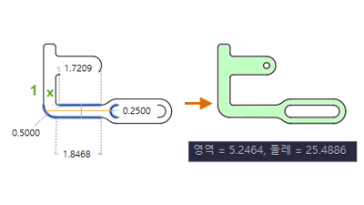 닫힌 영역 내부를 클릭하면 녹색으로 강조 표시되고, 계산된 값이 명령 윈도우 및 동적 툴팁에 현재 단위 형식으로 표시됩니다. Shift 키를 누른 채 클릭하여 여러 영역을 선택하면 누적 영역 및 둘레가 계산됩니다. 다음 그림에 표시된 것처럼 닫힌 고립영역의 둘레도 포함됩니다.