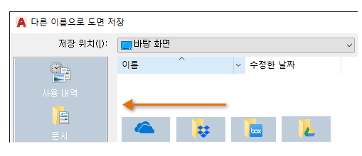 설치한 항목에 따라 AutoCAD 파일 선택 대화상자의 환경 리스트에 상자, 드롭박스(Dropbox) 및 다수의 유사한 서비스가 포함될 수 있습니다.
