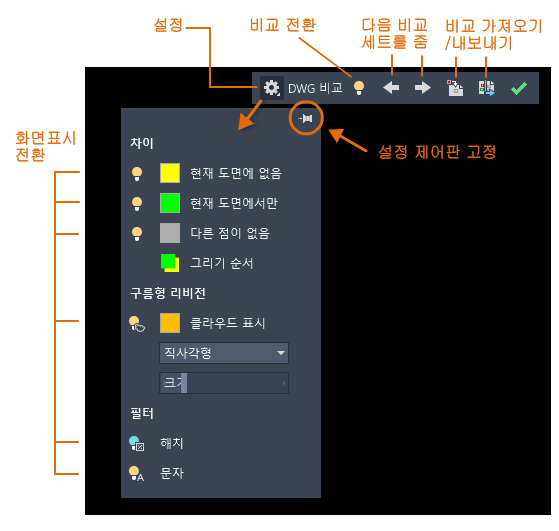 비교 상태에서 직접 편집을 용이하게 하기 위해 이 기능에 대한 옵션 및 컨트롤이 리본에서 도면 영역의 맨 위에 고정된 도구막대로 이동되었습니다. 대부분의 옵션이 표시된 대로 설정 컨트롤에 결합되고 향상되었습니다. 도구막대의 비교와 설정 컨트롤의 차이 유형 표시를 쉽게 전환할 수 있습니다.
