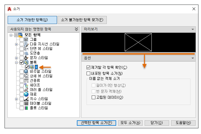 소거 기능이 도면을 보다 쉽게 정리하고 구성할 수 있게 수정되었습니다. 컨트롤 옵션은 거의 동일하지만, 방향이 보다 효율적이며 이제 미리보기 영역 크기를 조정할 수 있습니다.