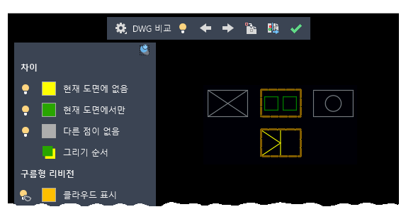 DWG 비교 기능의 주요 향상 기능은 비교 상태에 있는 동안 현재 도면을 지정된 도면과 직접 비교하고 편집할 수 있다는 것입니다. 현재 도면에서 비교가 수행됩니다. 현재 도면 또는 비교 도면에서 수행하는 변경 사항은 동적으로 비교되고 강조 표시됩니다.