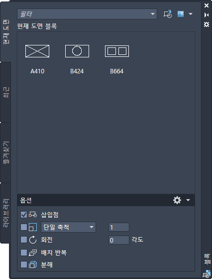이 두 옵션은 블록 팔레트에서 최근 탭 또는 다른 도면 탭으로 열립니다. 블록 팔레트의 현재 도면 탭은 리본 갤러리와 동일한 블록을 현재 도면에서 표시합니다. 블록 팔레트에서 블록을 배치할 때 끌어다 놓기 또는 클릭하여 배치하기를 사용할 수 있습니다.