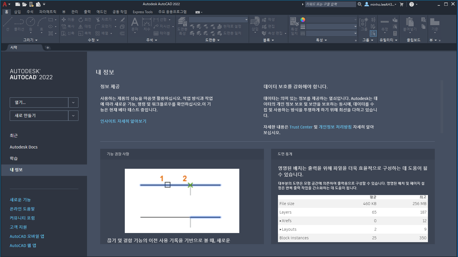 제품 사용 정보는 시작 탭에 표시됩니다. 내 정보는 AutoCAD 사용을 기반으로 사용자에게 표시되는 정보입니다. 컨텐츠는 정보를 제공하고 실행할 수 있도록 설계되었습니다. 다른 생산성 정보와 함께 시도해볼 수 있는 명령 및 기능에 대한 제안 사항을 참조하십시오.