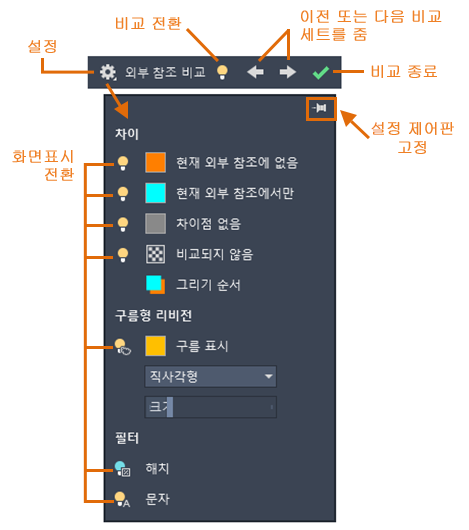 이제 도면 비교 기능과 유사하게, 현재 도면에서 외부 참조로 부착된 도면 파일에 대한 변경 사항을 비교할 수 있습니다.