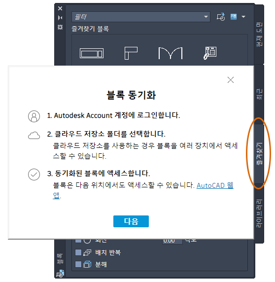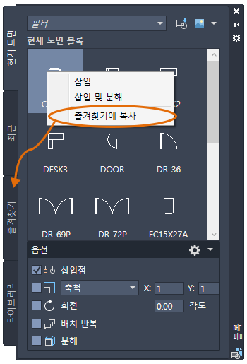 고급 팔레트를 사용하면 AutoCAD 도면 파일(DWG)을 라이브러리 탭에 먼저 추가하지 않고도 현재 도면에 블록으로 신속하게 삽입할 수 있습니다. 새로운 DWG를 블록으로 삽입 옵션(