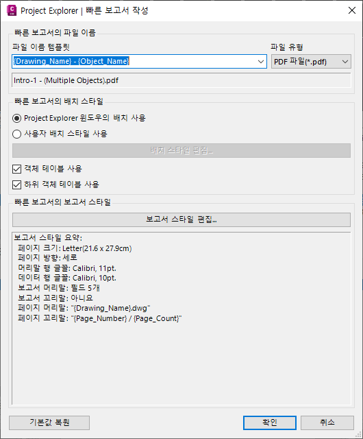 객체 세트 작성 윈도우에서 배치 스타일 및 보고서 스타일을 선택하고 생성할 보고서 파일의 파일 이름, 파일 유형 및 출력 경로를 설정합니다. 그러면 Project Explorer 윈도우 내의 객체 세트 탭에서 작업 실행 버튼을 클릭하여 보고서를 생성할 수 있습니다.