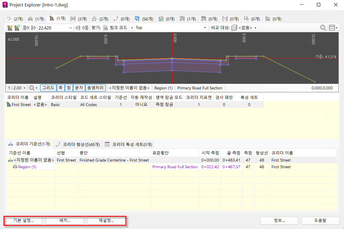 선 도면요소, 원곡선 도면요소 및 완화곡선 도면요소의 선형/종단 측점(측점) 간격을 수정합니다.