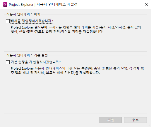 다음 두 가지 방법 중 하나로 Project Explorer 윈도우에 현재 지정되어 있는 배치 옵션을 기본값 설정으로 재설정할 수 있습니다.
