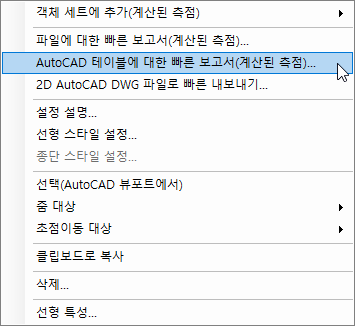 AutoCAD 테이블 작성 윈도우를 열려면 Project Explorer 윈도우의 객체 리스트 창에서 하나 이상의 객체를 선택하고 마우스 오른쪽 버튼 클릭 메뉴에서 AutoCAD 테이블에 대한 빠른 보고서 옵션 중 하나를 선택합니다.