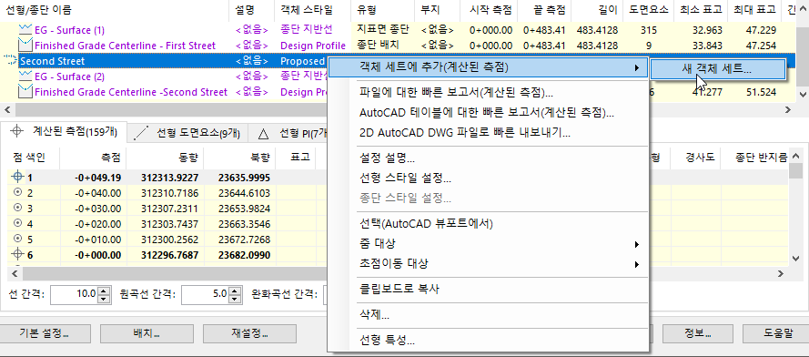 일부 객체 유형의 경우 AutoCAD 테이블에 포함할 하위 객체 유형을 선택할 수 있습니다. 예를 들어 선형의 경우 계산된 측점, 선형 도면요소, 선형 PI 또는 편경사 임계 측점이 포함된 하위 객체 테이블을 생성할 수 있습니다.