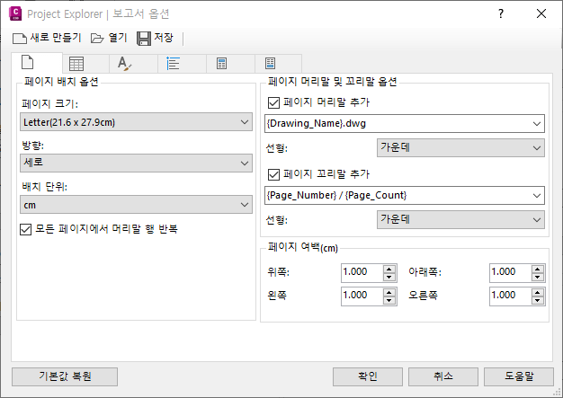 보고서 옵션에 따라 Project Explorer에서 생성된 모든 보고서 및 스프레드시트에 대한 페이지 크기, 페이지 방향, 페이지 여백, 보고서 헤더, 페이지 헤더 및 페이지 바닥글 설정이 결정됩니다.