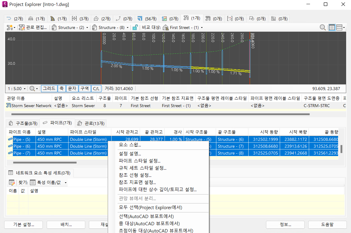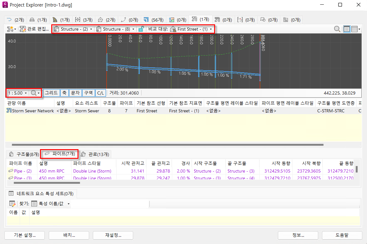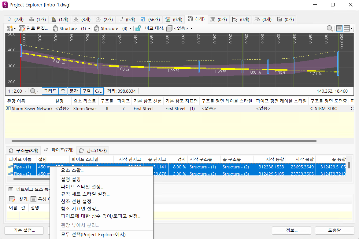 Project Explorer를 사용하면 단일 작업으로 전체 관로의 경사를 조정할 수 있습니다. 지금 해 보겠습니다.