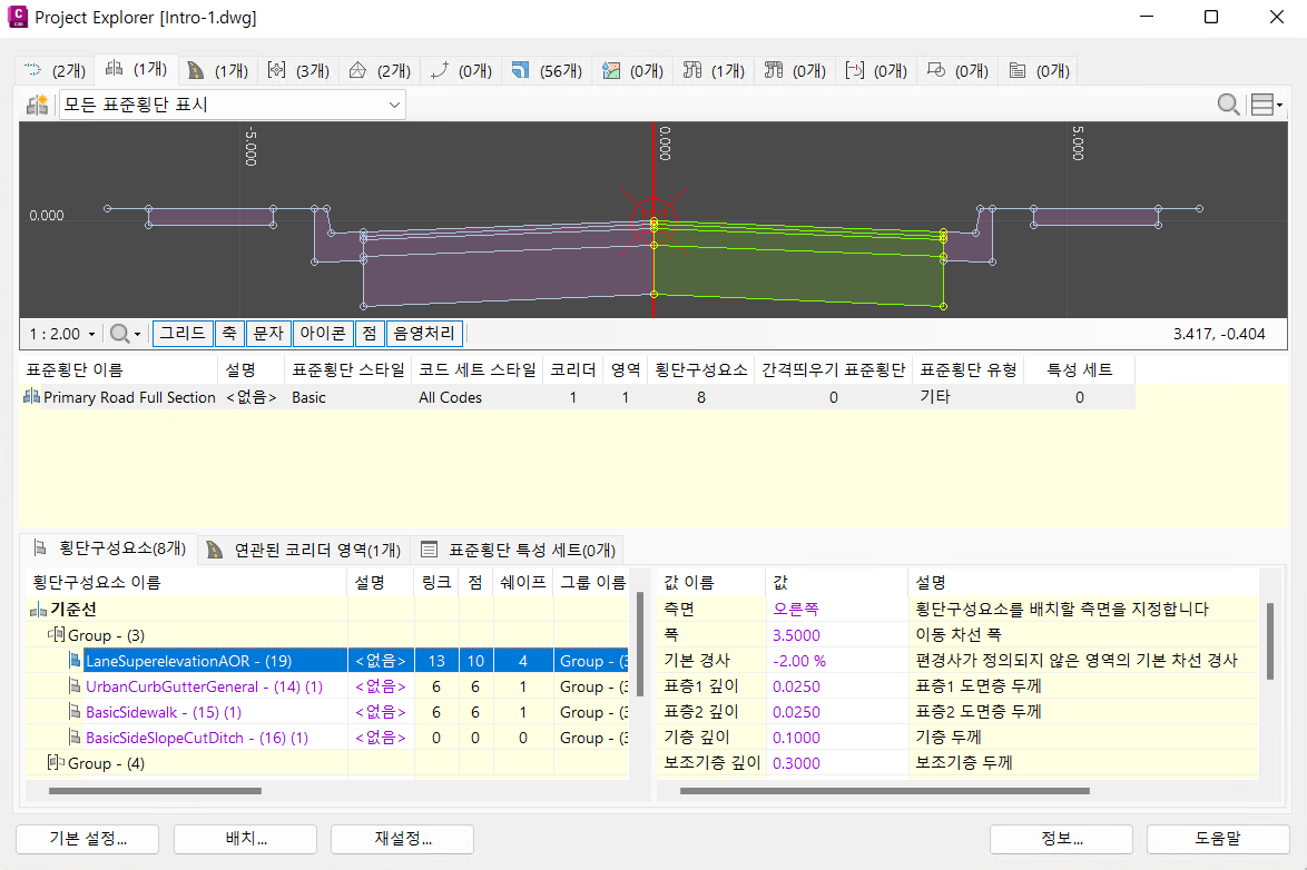 - 이 횡단구성요소의 매개변수가 표시되며, 표준횡단 횡단 뷰는 선택된 횡단구성요소의 지오메트리를 나타냅니다.