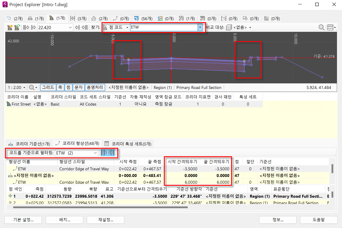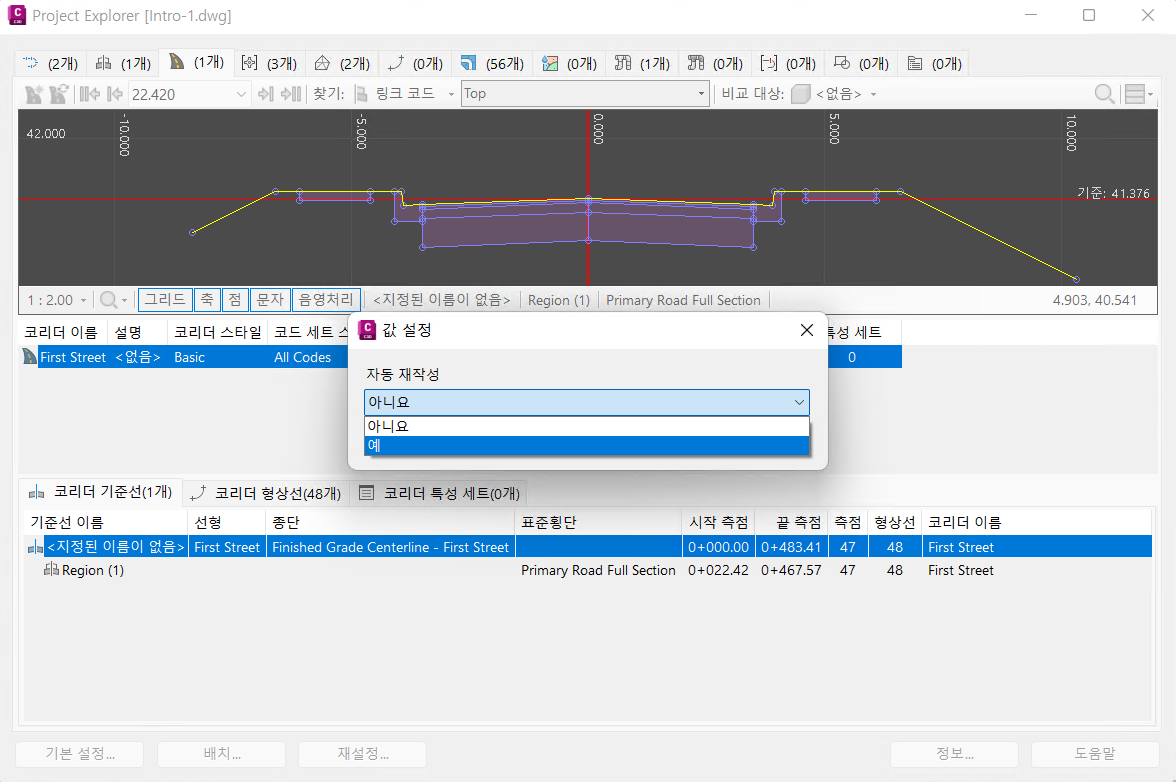 먼저 이 표준횡단에 적용한 변경 사항이 연관된 코리더에 즉시 반영되는지 확인합니다.
