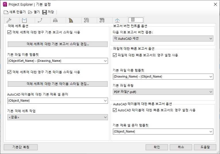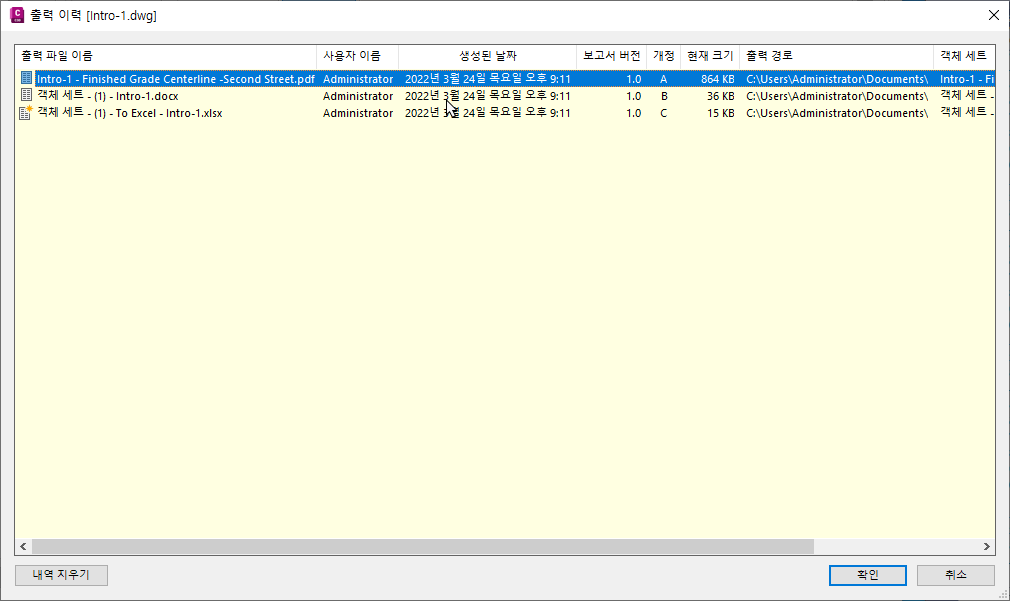 Project Explorer에서는 특정 AutoCAD 도면에서 생성한 모든 보고서의 영구 레코드를 유지합니다. 이러한 레코드는 출력 내역 윈도우에서 검토할 수 있습니다. 이 대화상자에는 다음 두 가지 방법으로 액세스할 수 있습니다.