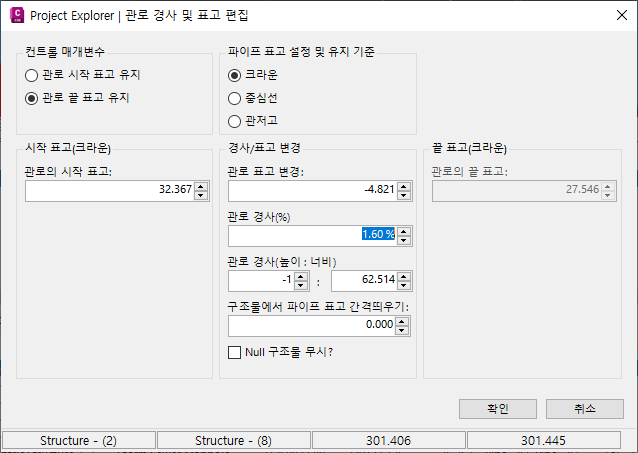 - 관로 경사 및 표고 편집 대화상자가 열립니다.