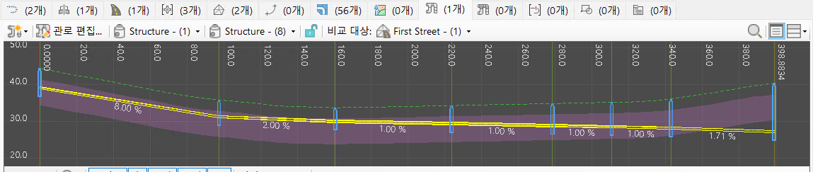 - 관망 종단 뷰 도구막대에서 관로에 대한 시작 및 끝 구조물을 다음으로 설정합니다.