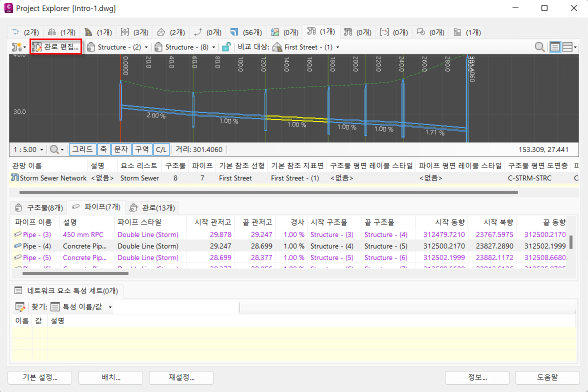 - 관망 탭의 주 도구막대에서 관로 편집 버튼을 누릅니다.