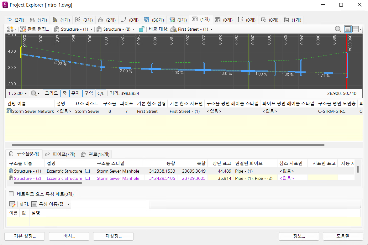 이 튜토리얼의 이후 단계 중 일부는 이 관망의 모든 구조물 및 파이프에 대해 참조 지표면이 설정되었는지에 따라 다릅니다. Project Explorer를 사용하면 단일 작업으로 관망의 여러 요소에 대해 참조 지표면을 설정할 수 있습니다.