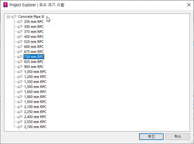 - 요소 크기 스왑 대화상자에서 750mm RPC 콘크리트 파이프를 선택하고 확인을 클릭합니다.