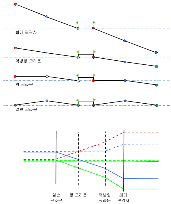 주: 다른 설명이 없는 경우, 모든 편경사 다이어그램은 오른쪽 원곡선을 보여 줍니다.