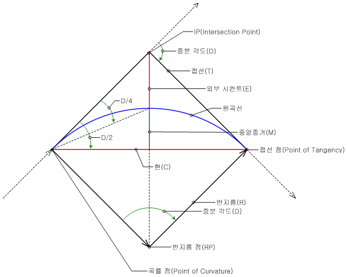 다음 그림에는 Autodesk Civil 3D에서 사용된 원곡선 매개변수가 표시됩니다.