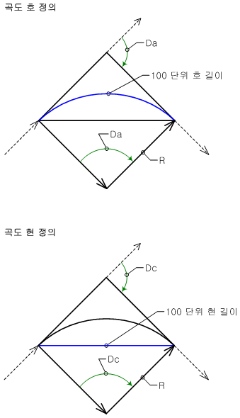 - 호 정의: 곡도가 호를 기준으로 결정되도록 지정합니다. 원곡선이 도로 원곡선이면 이 옵션을 사용합니다. 도로 원곡선의 경우 곡도는 100단위 원형 호에 대응되는 중심각입니다.