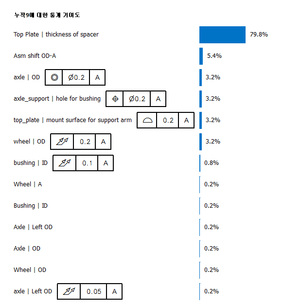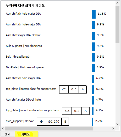 테이블 하단에서 기여도 탭을 선택하여 기여도 그래프를 표시해 각 치수의 기여도를 확인할 수 있습니다. 이 정보는 과도한 변이가 감지된 경우 먼저 줄여야 할 공차를 식별하는 데 유용합니다. 누적 및 해당 상대적 기여도에 영향을 미치는 치수 및 공차 리스트가 가장 큰 값부터 작은 값 순서로 정렬됩니다.