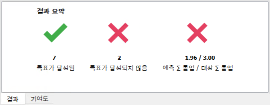 공차 분석 패널 맨 아래에는 결과 창이 있습니다. 누적이 여러 개 있는데 아무것도 선택하지 않은 경우 결과 창에는 달성한 목표와 달성하지 못한 목표의 개수 요약과 설정에서 지정한 기본 품질 미터법을 사용한 품질 롤업이 표시됩니다.