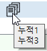 치수가 두 개 이상의 누적에 사용되는 경우 공유 치수 아이콘이 나타납니다. 아이콘 위에 마우스를 가져가면 해당 치수를 포함하는 누적 리스트가 표시됩니다.
