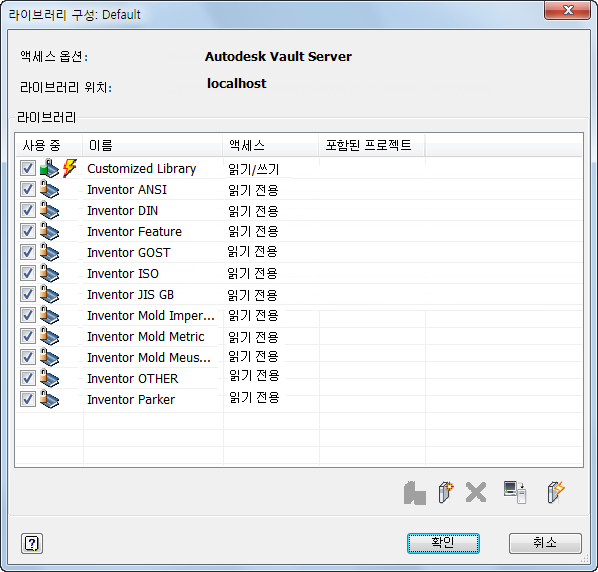 - 프로젝트 대화상자에서 "컨텐츠 센터 라이브러리 구성" 버튼을 클릭하여 라이브러리 구성 대화상자를 시작합니다. 그림 1을 참고하십시오.