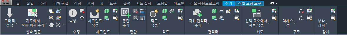 전기 리본 탭을 통해 AutoCAD Map 3D 도구 세트 전기에서 일반적인 작업에 액세스할 수 있습니다. 예를 들어, 세그먼트 패널을 사용하여 세그먼트를 작성하고 횡단 패널을 사용하여 횡단을 추가한 다음 덕트 및 컨덕터 패널을 사용하여 덕트 및 컨덕터를 추가할 수 있습니다. 회로 패널을 사용하여 피쳐를 선택하거나 추적을 수행함으로써 회로를 정의합니다. 구조 및 장치 패널을 사용하여 구조 및 장치를 추가합니다. 전기 리본 탭을 사용하여 작성하는 피쳐는 전기 탐색기의 해당 컨테이너에 표시됩니다. 전기 탐색기를 참고하십시오.