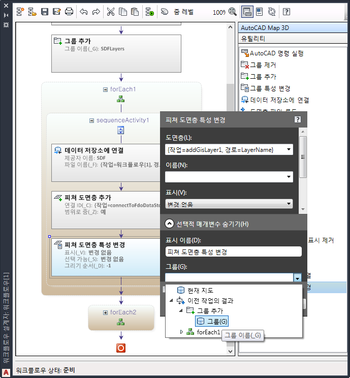 추가된 각 도면층의 그룹 특성을 변경할 것이므로 이 작업을 “LoopAddLayers”라는 ForEach 작업 안에 배치합니다.