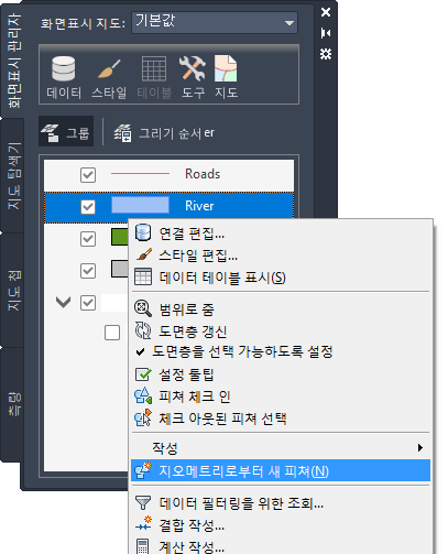 화면표시 관리자에서 임의의 피쳐 도면층에 조회를 적용합니다.
