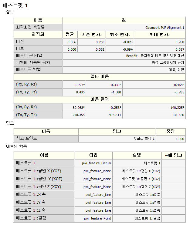 - 계산 정보에는 점의 현재 평균 및 표준 편차와 이 결과를 얻기 위해 사용된 회전 및 변환이 표시됩니다.